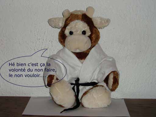 état de conscience où le signifiant a disparu ? Marguerite : Je pense que vous voulez parler du kiaï. Comme le dit le sage, un dessin vaut mieux que mille mots, regardez donc le biscuit qui se trouve à côté de votre tasse de thé, le voyez-vous ? Causepsy : Oui Maître. Marguerite : Comment est-il ? Causepsy : (???) Comme un biscuit. Marguerite : En combien de morceaux est-il ? Causepsy : En un seul, je n'y ai pas touché. Marguerite : Bien, éloignez-vous un peu...
